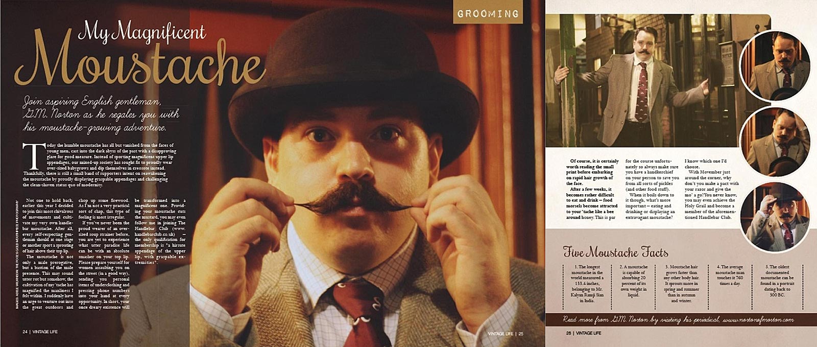 Residing in the fine city of Manchester, he aspires to better himself in the ways of old, while showing the world that old-fashioned doesn't mean outdated. As a stickler for punctuality, he writes a blog post every Saturday at 4 o'clock over at www.nortonofmorton.com You may like to read his 'Post' therein in which G.M. Norton realises a 20 year ambition. G.M. Norton also writes, “I thought you might be interested to know that the Handlebar Club will be mentioned in a new publication called His Vintage Life. “Out on 5th September 2013 from Messrs W.H. Smiths, there is a three page feature on moustaches penned by myself. I've attached a little pictorial of the spread. “I am also writing a moustache growers guide for another publication, out in November to coincide with Movember, where I also intend to include our illustrious club.”
